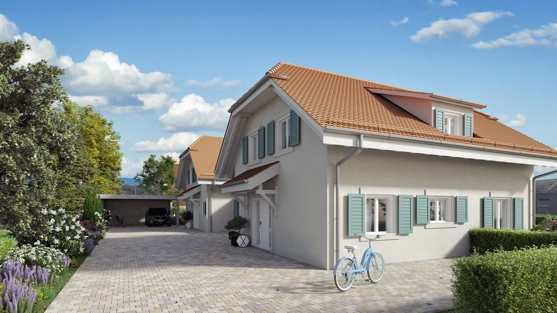 Les stores à lamelles et les volets sont en aluminium. La PAC air/eau dans un sous-sol commun garanti comfort et performance énergétique.